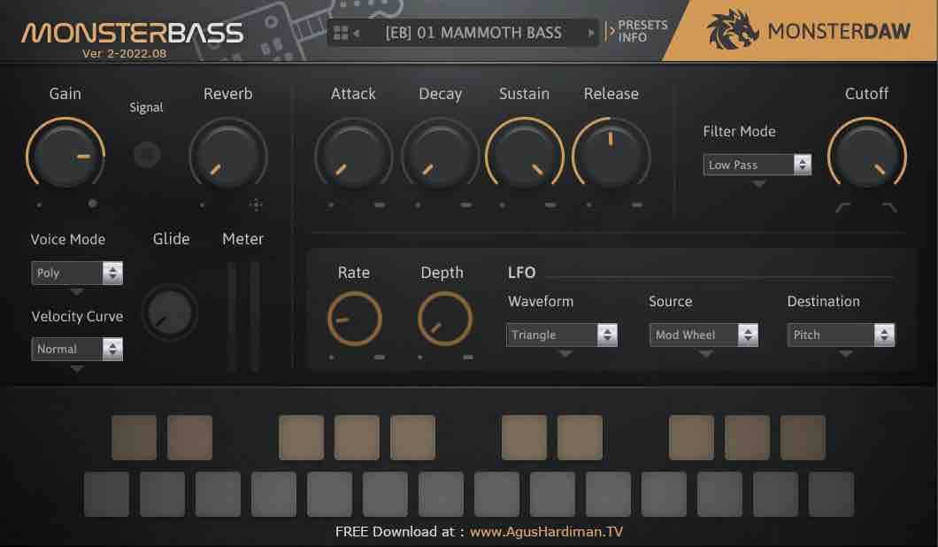 Agus Hardiman által fejlesztett Monster Bass plugin dedikált basszus hangokat tartalmaz electric bass, synth bass és acoustic bass kategóriákban. A plugin mérete ne tévesszen meg senkit, ez egy ROMPLER, amelybe be kell tölteni az 1.3 GB-os könyvtárat is. Letöltés: https://agushardiman.tv/monster-bass-a-complete-bass-plugin-for-your-low-end-needs/ Library: https://drive.google.com/open?id=1EEMAPUs1D52KGcdy3HdBEN53HlxSSTnT&authuser=0