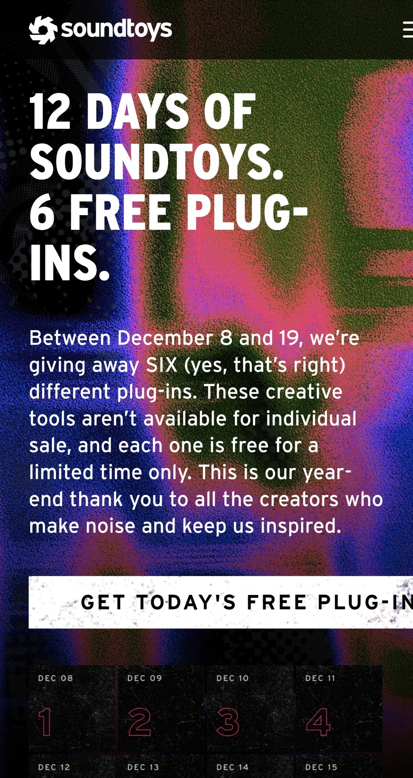 A SoundToys adventi játékot indított, mely alatt (december 8-19) 6 pluginjét is ingyen elérhetővé teszi. Regisztrálj az alábbi oldalon és nézz be minden nap az adventi ajándék pluginekért! Regiaztráció: https://www.soundtoys.com/12-days-of-soundtoys/